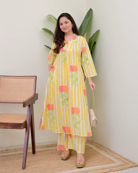 PRODUCT DETAILSÂ Beautiful V Neck Printed Rayon Kurta with Palazzo SetRegular Fit 3/4 SleevesHand Wash OnlyYellow...