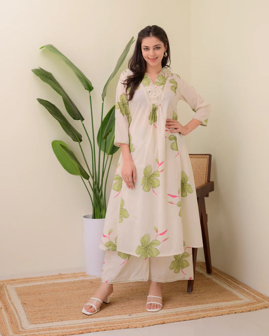 PRODUCT DETAILS Beautiful V Neck Printed Rayon Kurta with Palazzo SetRegular Fit3/4 SleevesHand Wash OnlyCream Color Fabric...