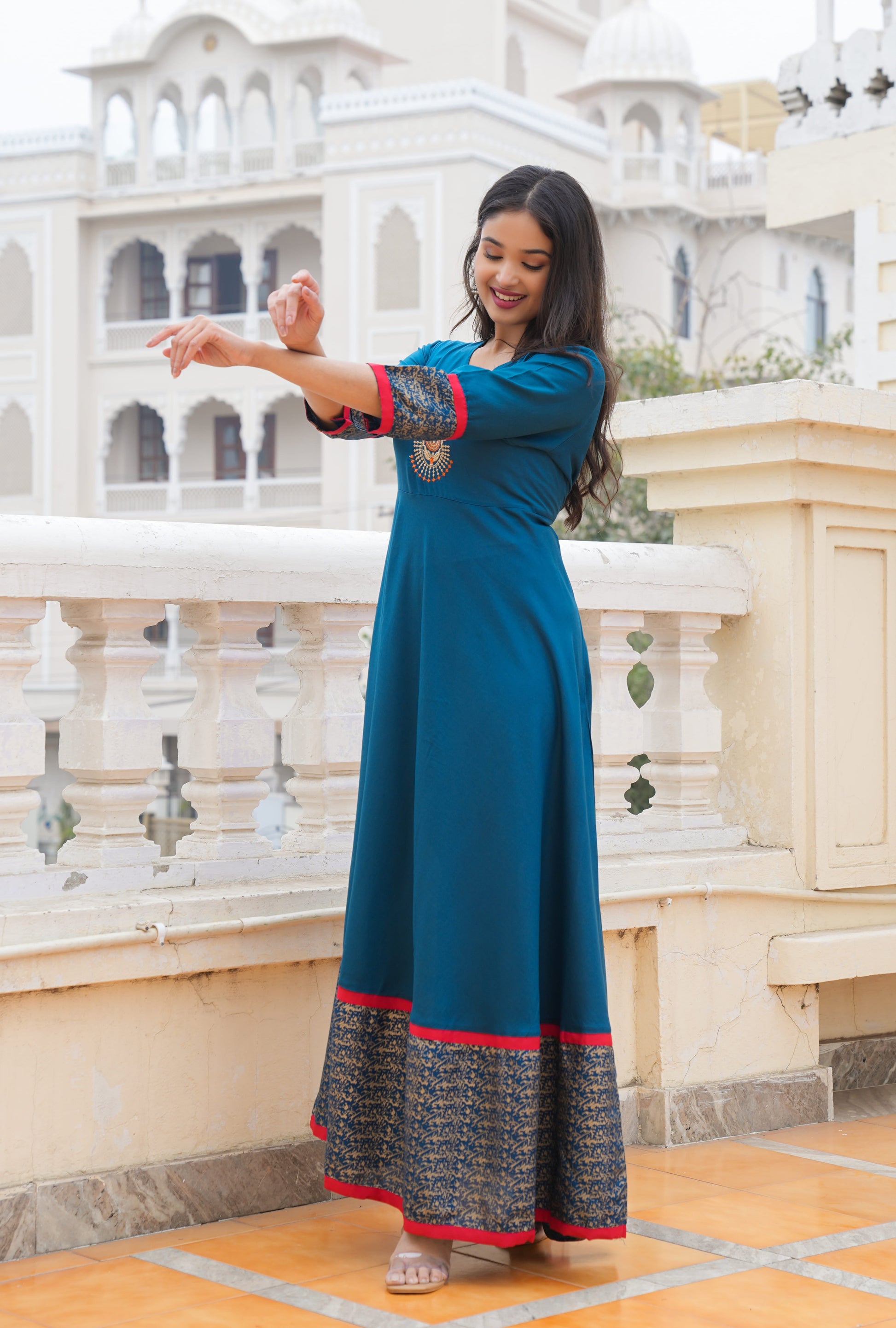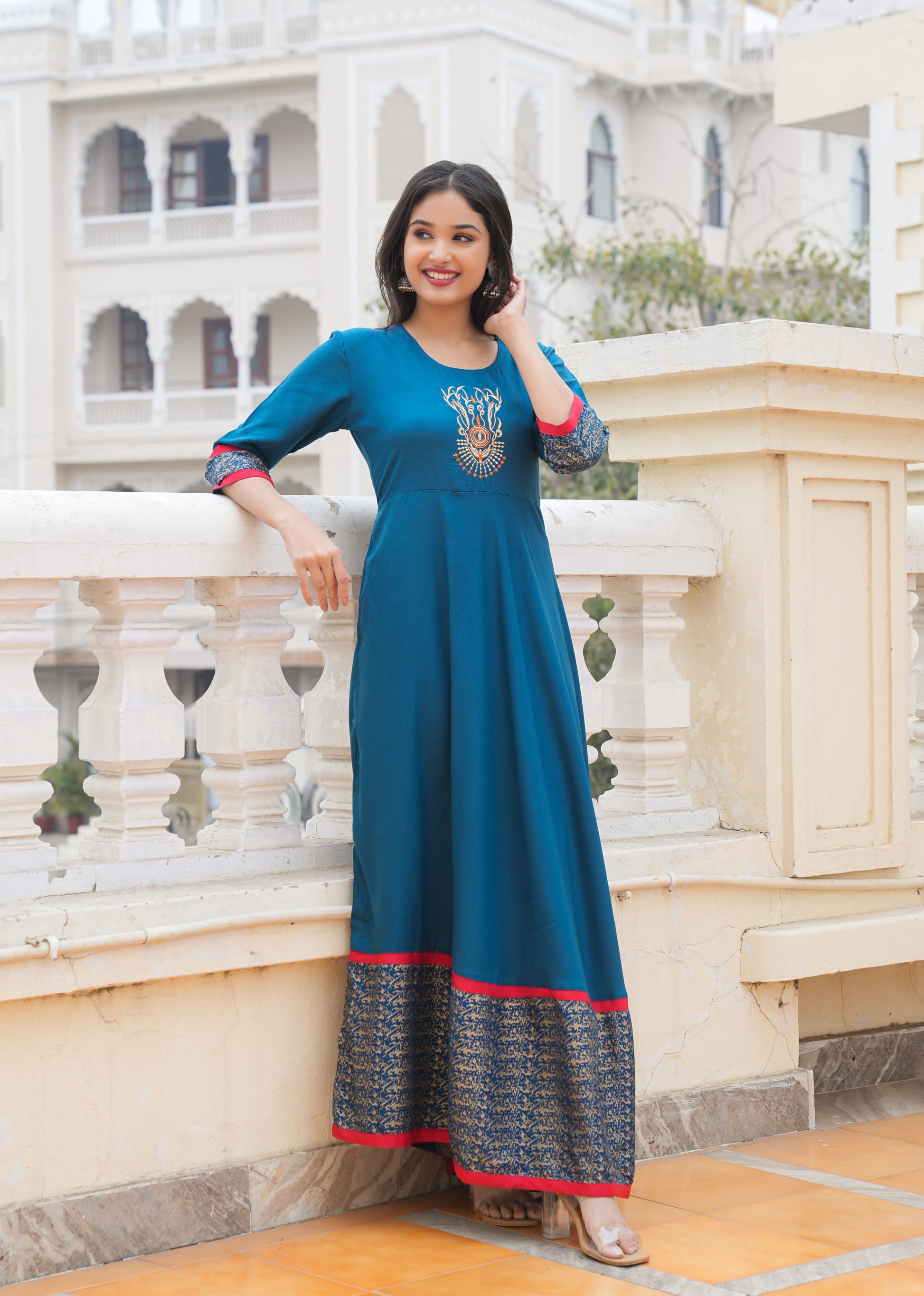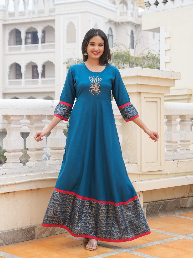 Embroidered Gold Printed Anarkali Gown (Blue)