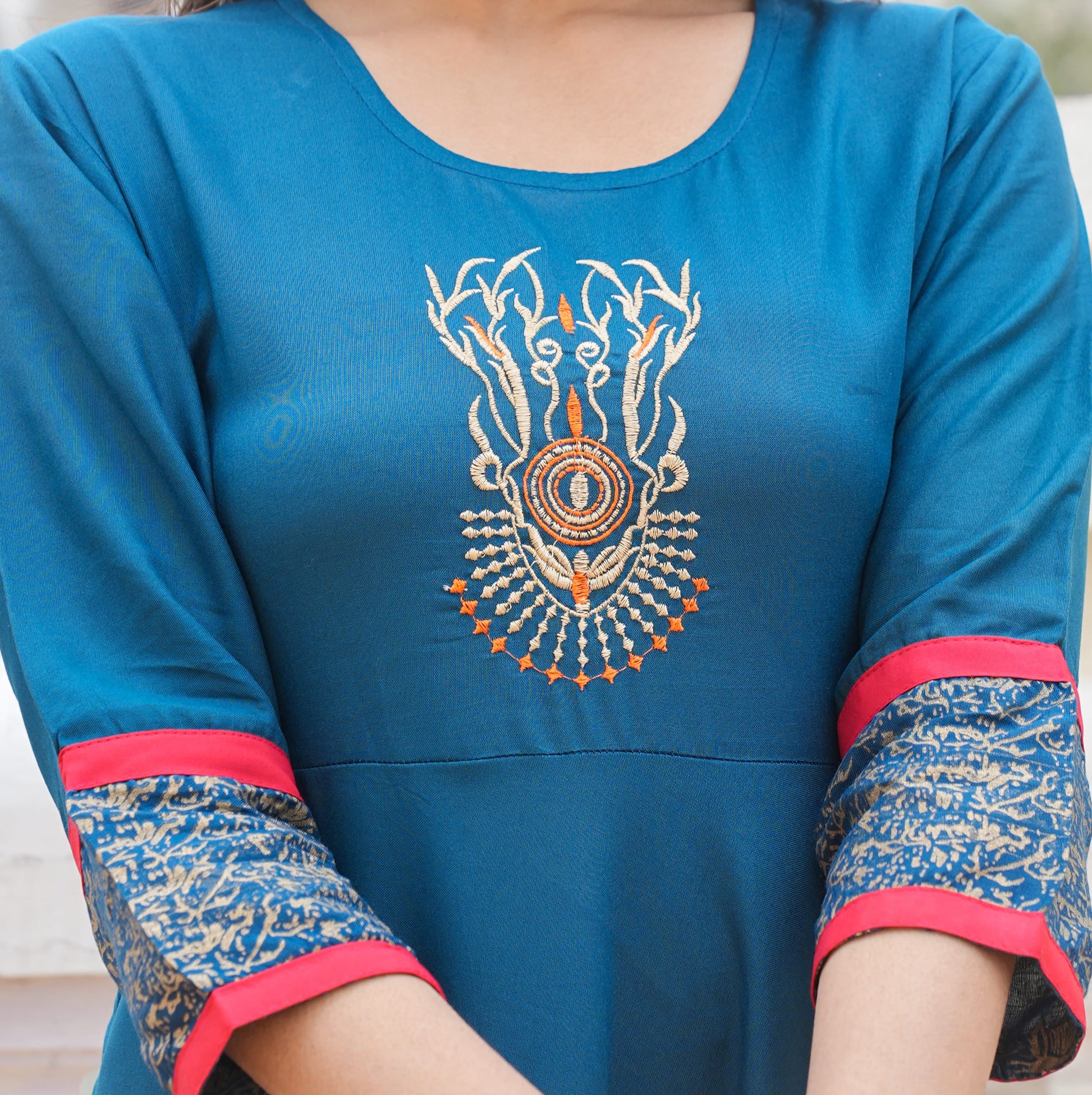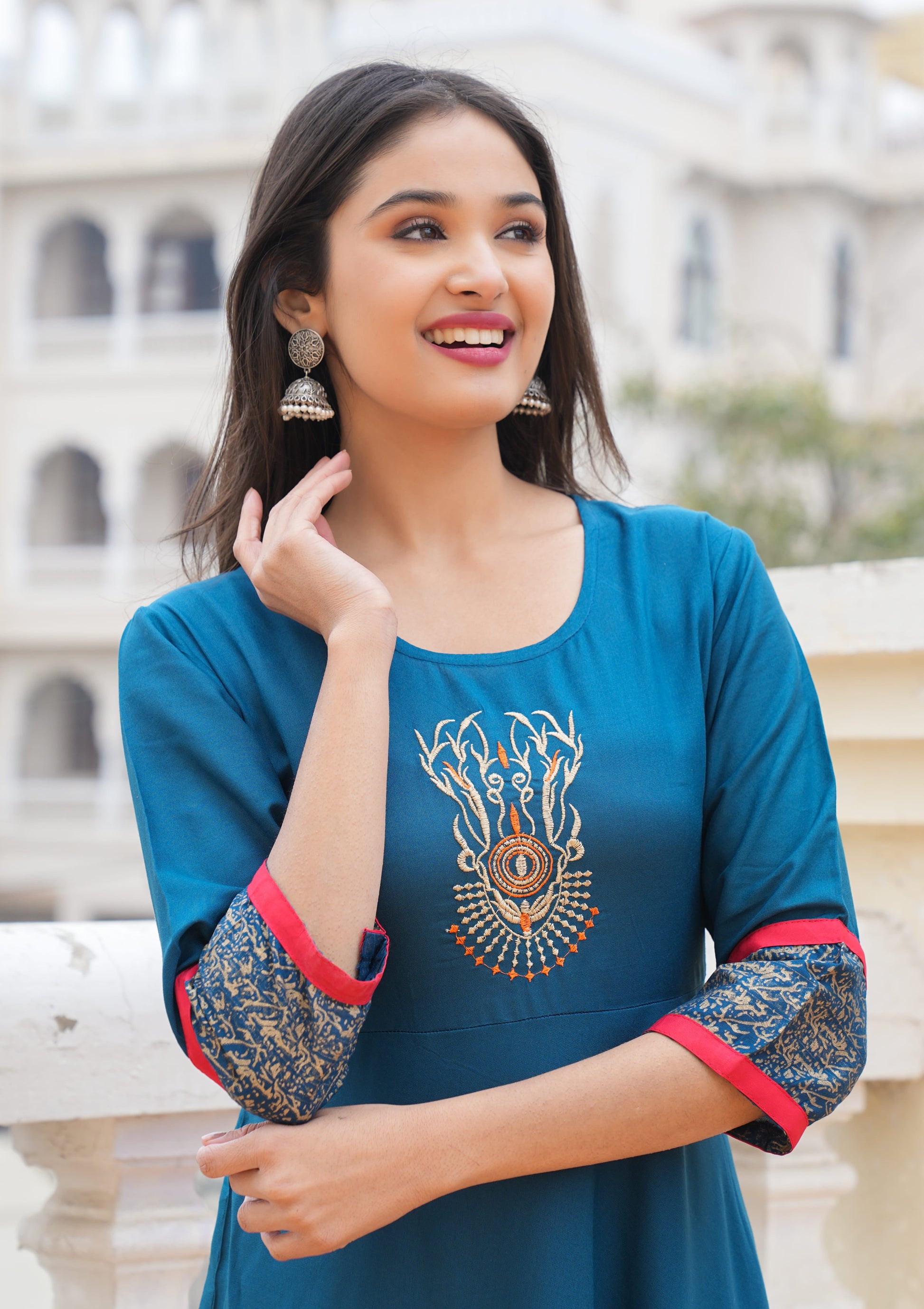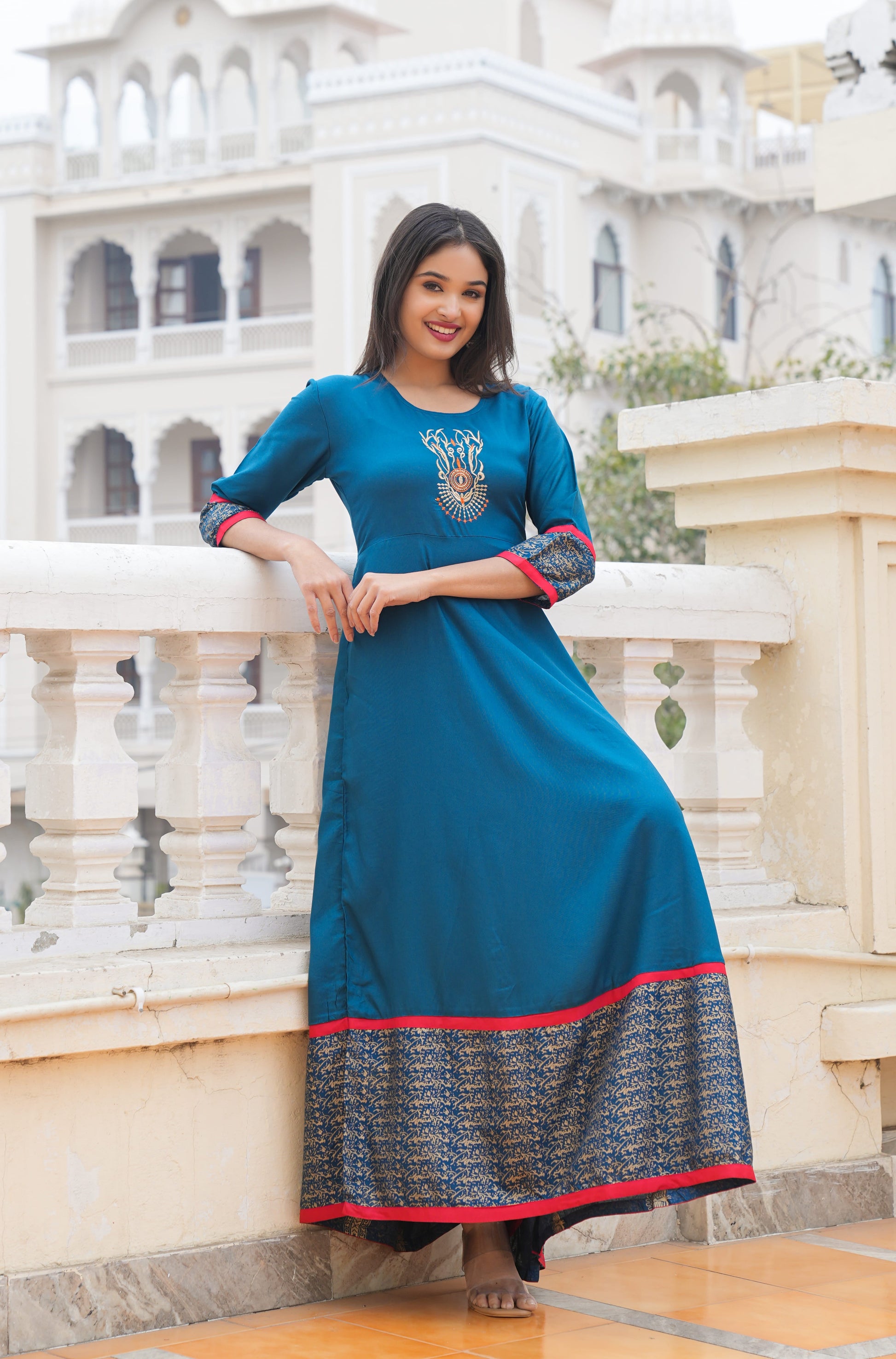 Embroidered Gold Printed Anarkali Gown (Blue)
