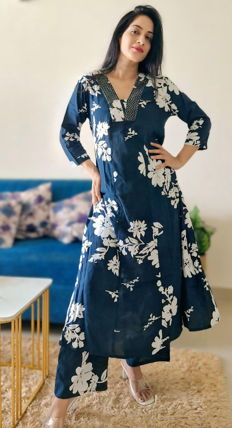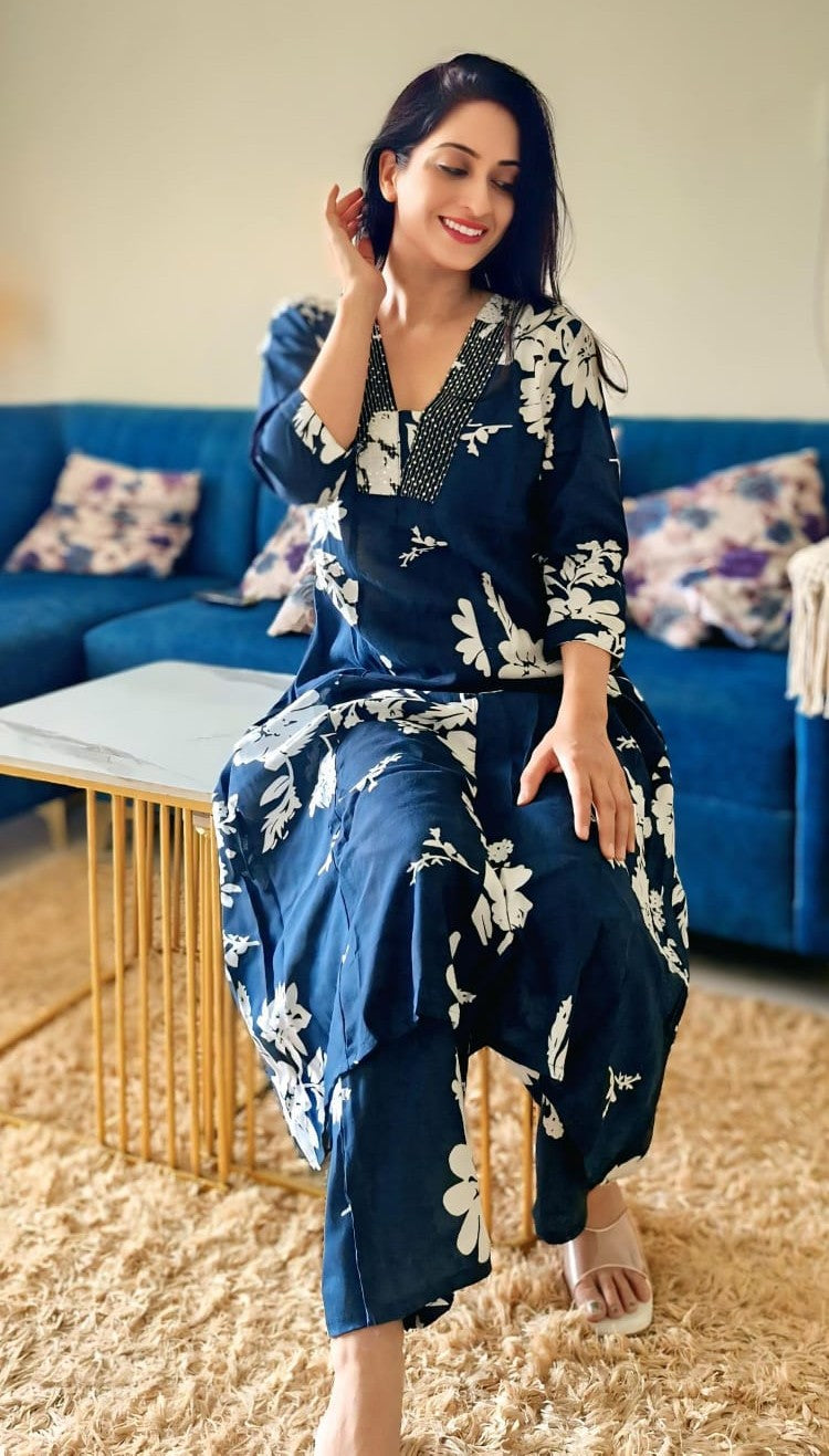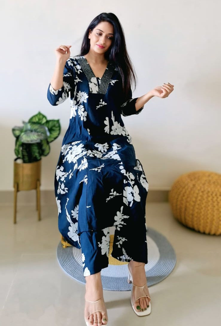 Beautiful V Neck Printed Rayon Kurta with Palazzo Set