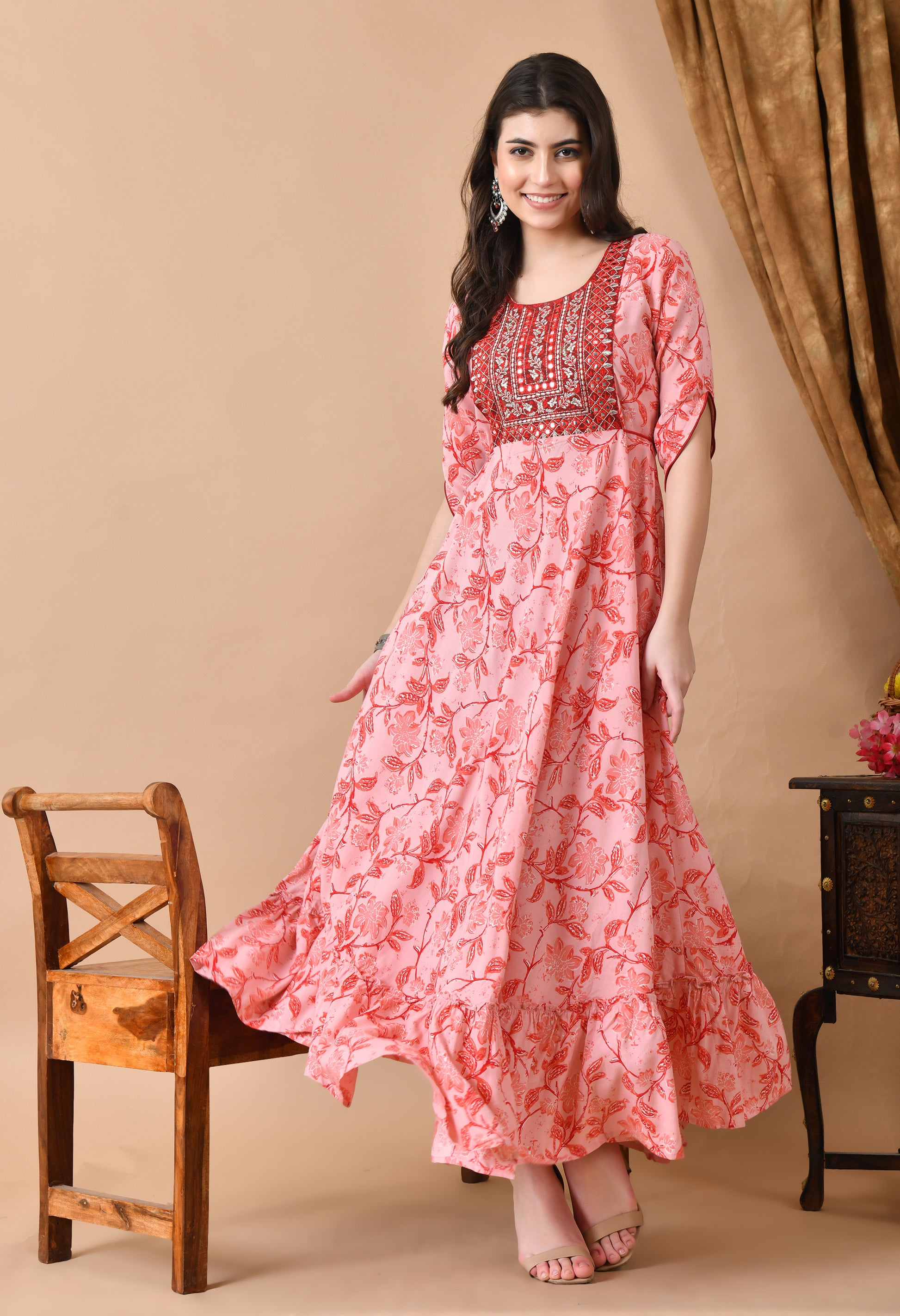 Printed Viscose Rayon Stitched Anarkali Gown (Pink)